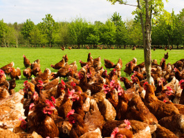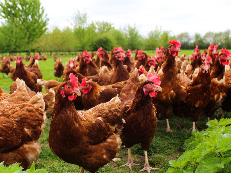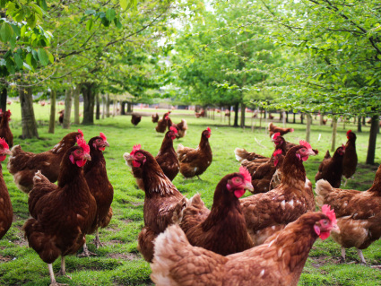 Hens that are free to range on grass and woodland during the daylight hours